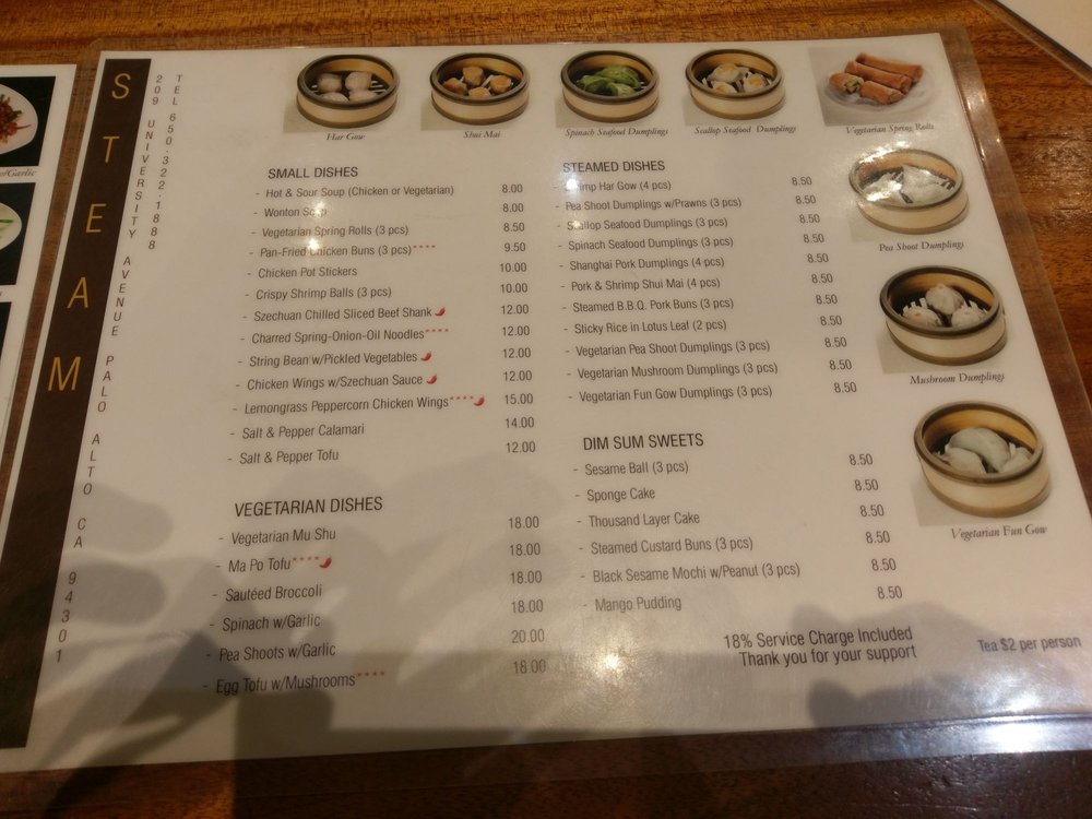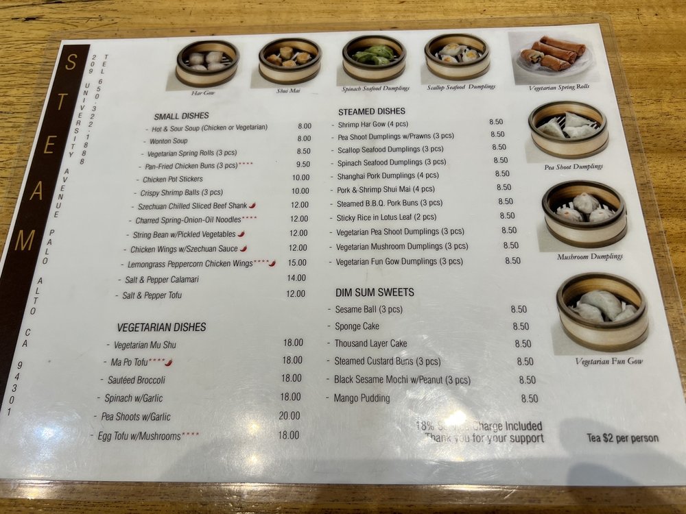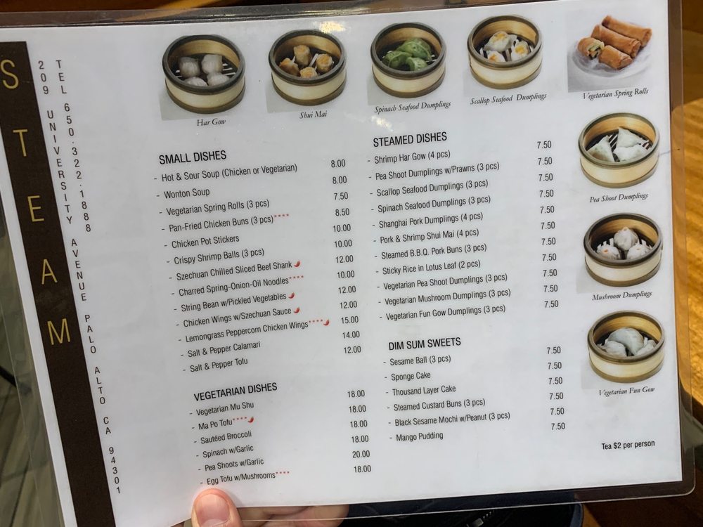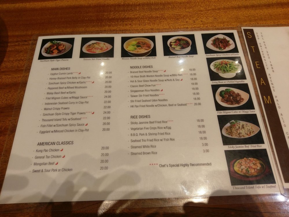 Steam, located in downtown Palo Alto, offers a diverse menu with options such as beef chow fun, garlic green beans, gluten-free steam buns, rice noodle dishes, beef basil, mapo tofu, and vegetarian mu shu. Customers have praised the quality of the food and the variety of vegan and vegetarian options available. The restaurant provides a casual ambiance with outdoor seating, making it a great choice for groups and families. Reviews mention the attentive service and the convenient location with ample parking. While some find the prices to be on the higher side, the overall dining experience at Steam is worth a visit for those looking for flavorful Chinese cuisine in a modern and welcoming setting.
